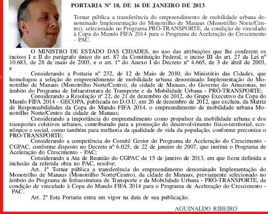 O ministro das cidades, que assina a Portaria, diz que o monotrilho é importante como propulsor da mobilidade urbana e dos transportes coletivos urbanos, contribuindo para a promoção do desenvolvimento físico-territorial, econômico e social, como também para melhoria da qualidade de vida da população"de Manaus.