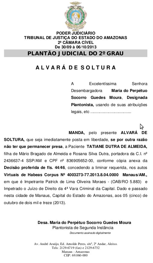 A desembargadora Socorro Guedes Moura, plantonista do Tribunal de Justiça do Amazonas, concedeu habeas corpus à operadora de caixa Tatiane Dutra Almeida, apontada pela polícia como mentora do assalto ao restaurante Xavier, o Rei do Carneiro, onde morreram o dentista Diego Maciel Almeida Castro, 26, e Francisco Xavier de Castro, de 53 anos.