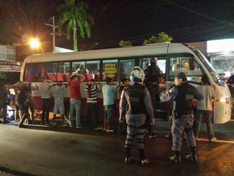 A ação policial foi colocar todos os homens para fora, e revistar, um a um, enquanto estes se mantinham encostados ao veículo com as mãos na cabeça.