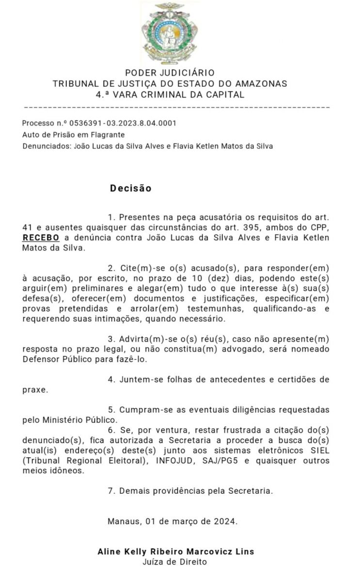 Manaus/AM - O influencer João Lucas da Silva Alves, o ‘Lucas Picolé’, e a ex-funcionária pública municipal Flávia Ketlen da Silva foram denunciados pelo Ministério Público do Amazonas (MPAM) por receptação qualificada. A Justiça do Amazonas acatou o pedido do MP e na segunda-feira (1º) e tornou os dois réus pelo crime.