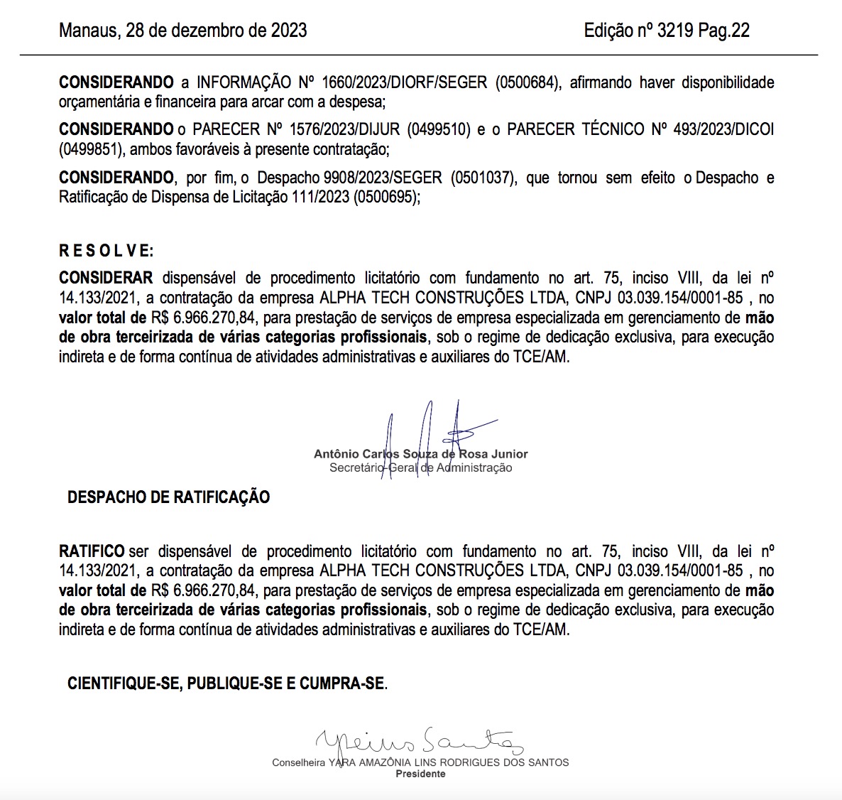 A descontinuidade do contrato n. 56/2022 assim como o contrato sem licitação da Alpha Tech foi publicado no Diário Oficial dessa quinta-feira (28).
