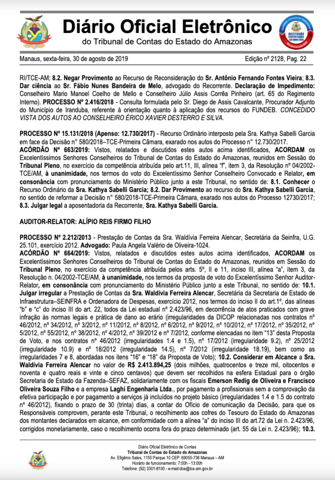 A ex-secretária da Seinfra, Waldívia Ferreira Alencar foi multada em R$ 7,3 milhões por pagamentos irregulares de obras em 2012. A decisão foi do Tribunal de Contas do Estado e divulgada no Diário Oficial.