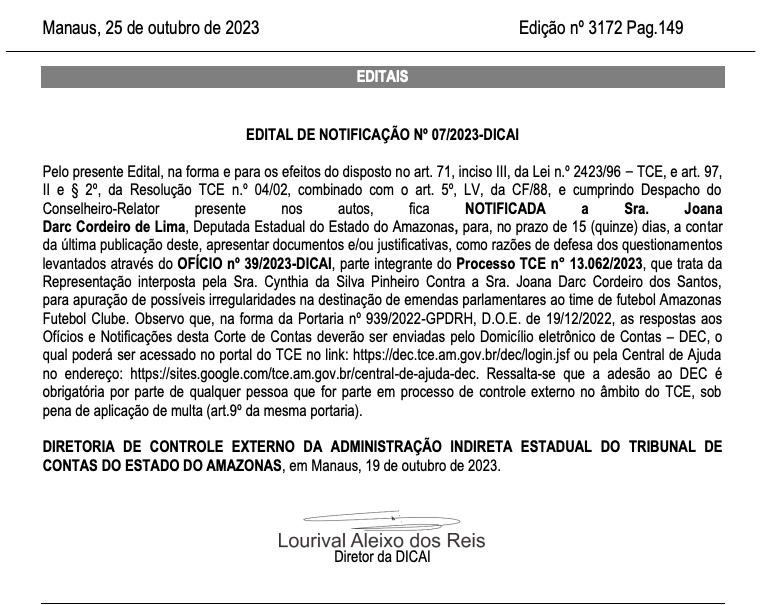 A deputado possui prazo de 15 dias após a publicação do edital de notificação no Diário Oficial do TCE-AM, que ocorreu na quarta-feira (25).