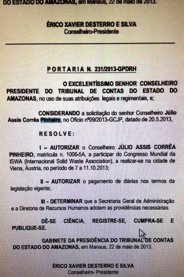 O conselheiro Júlio Pinheiro, do Tribunal de Contas do Estado do Amazonas, conhecerá Viena, na Áustria em outubro. Ele teve autorização para passar quatro dias na cidade, onde participará do Congresso Mundial da ISWA - International Solid Waste Association, que reunirá especialistas do setor de resíduos. O tribunal explicou a relação que tem o seminários com a atividade que o conselheiro exerce na Corte.