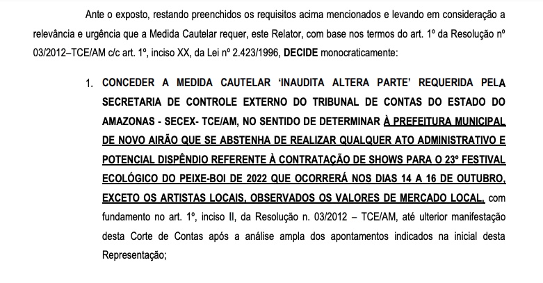 A suspensão foi solicitada pela Secretaria Geral de Controle Externo do TCE que apontou sobrepreço no contrato do artista e ainda ilegitimidade na despesa frente a outros gastos prioritários que a Prefeitura de Novo Airão deveria realizar no município. Mário Filho verificou a existência de tais indícios, mesmo com a prefeitura indicando que custearia apenas R$ 100 mil do valor do contrato com recursos públicos e que R$ 600 mil seriam oriundos de patrocínios.