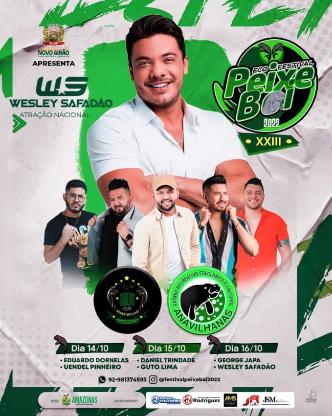 Manaus/AM - O conselheiro substituto do Tribunal de Contas do Estado do Amazonas (TCE-AM), Mário Costa Filho, determinou a suspensão da contratação do cantor Wesley Safadão para realizar show na cidade de Novo Airão. O artista foi contratado pelo valor de R$ 700 mil, para se apresentar na 23ª edição do Eco Festival do Peixe-Boi, no dia 16 de outubro.