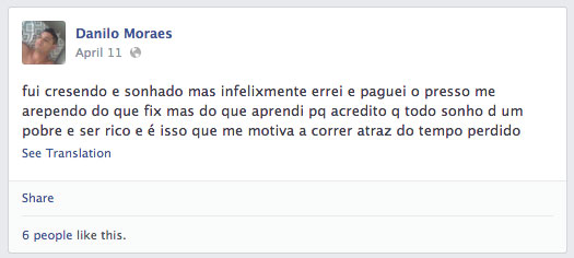 No seu perfil do Facebook, muitas fotos onde ele mesmo aparece, com frases soltas. Numa delas, ele diz querer ser rico.