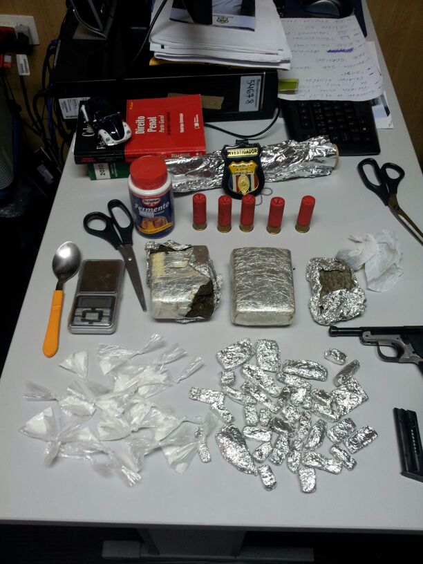 Eduardo de Almeida Noronha, 35 anos, foi preso ontem na Travessa São Geraldo, bairro do mesmo nome, com armas de grosso calibre, um quilo de maconha e uma quantidade não especificada de cocaina, além de apetrechos para fabricação da droga. Ele será envcaminhado hoje à Cadeia pública Raimundo Vidal Pessoa sob a acudsação de tráfico e uso ilegal de arma de fogo.