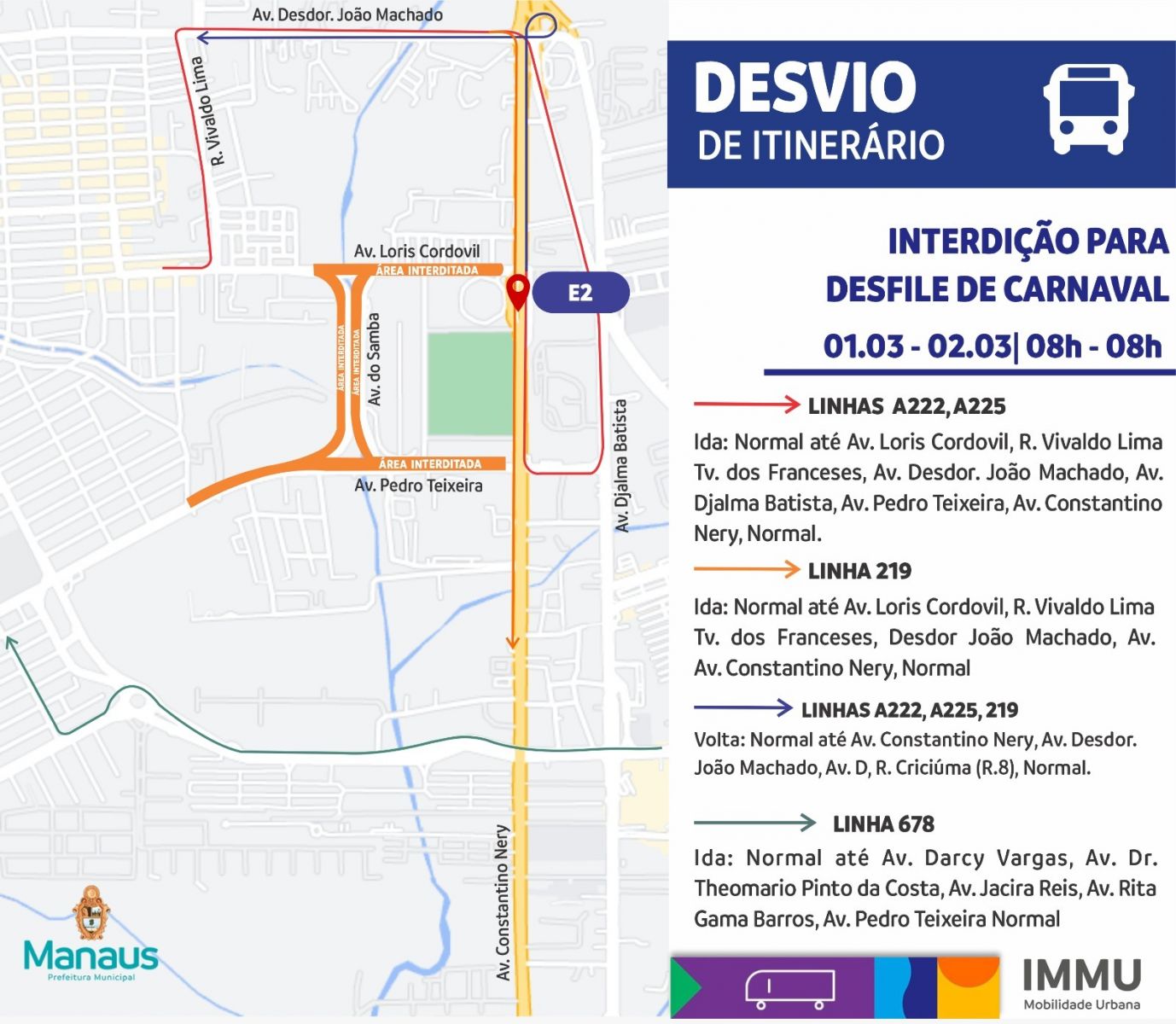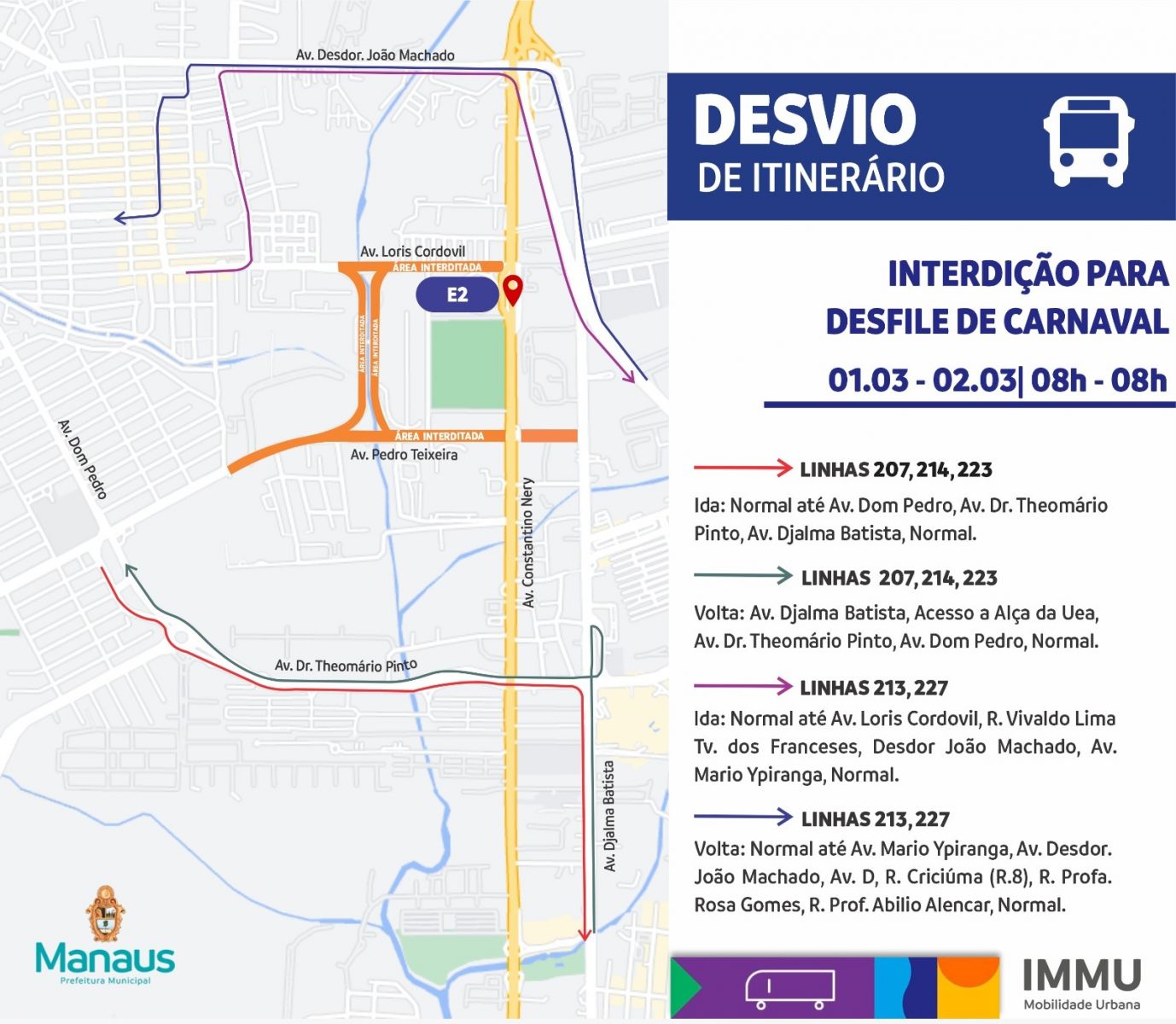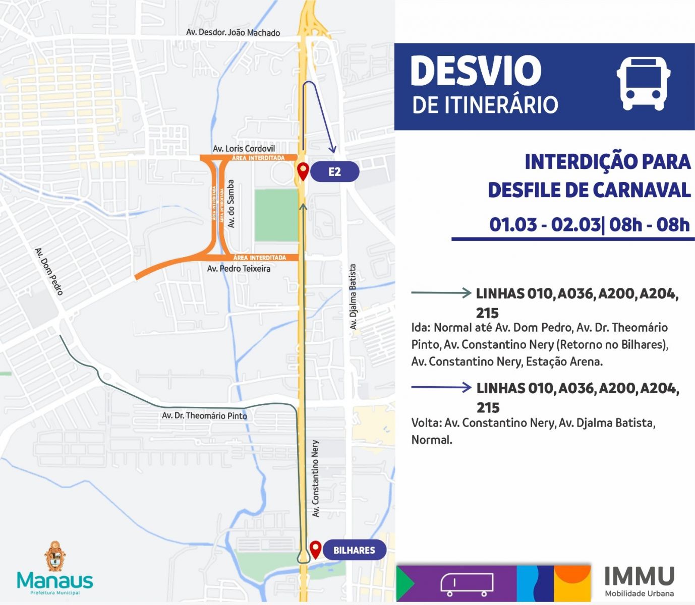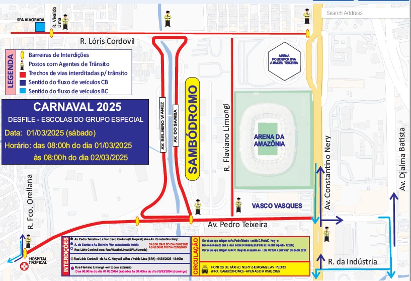 Neste sábado, (1º), as interdições iniciam às 8h com fechamento da avenida Pedro Teixeira, entre a rua Francisco Orellana (próximo ao hospital Tropical) e avenida Constantino Nery. A alameda do Samba e avenida Belmiro Vianez (extensão total das vias) também estarão interditadas. Nestes trechos, as interdições permanecerão até as 8h de domingo, 2/3.