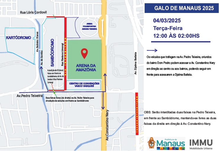 Ainda entre às 8h do sábado e às 8h do domingo, a rua Flaviano Limongi (via entre a Arena da Amazônia e o sambódromo) estará interditada em toda sua extensão.
