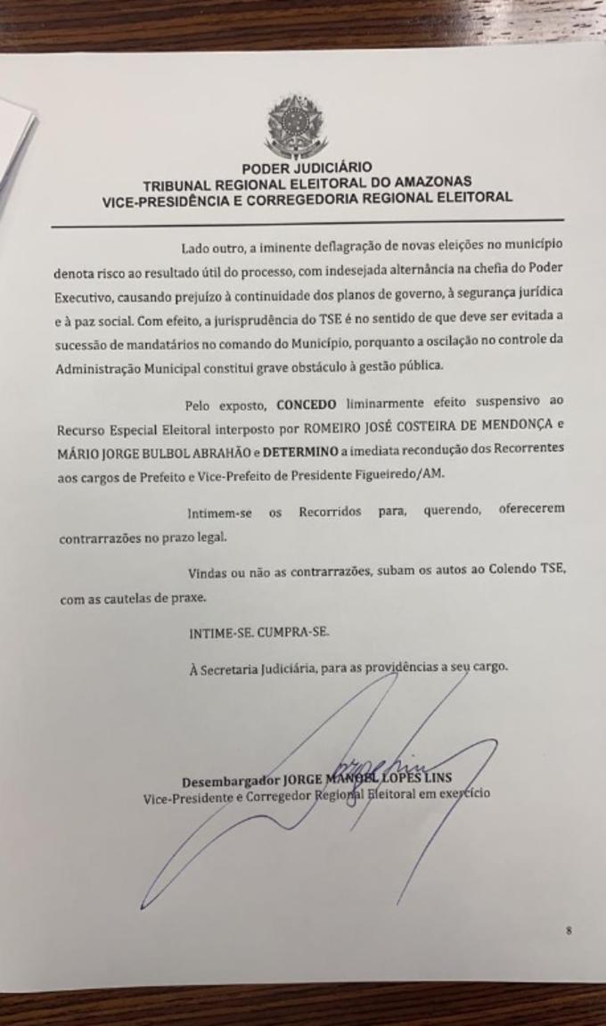 Manaus/AM - O vice-presidente do Tribunal Regional Eleitoral do Amazonas (TRE-AM), desembargador Jorge Lins, concedeu liminar com efeito suspensivo da decisão que afastava imediatamente do cargo o prefeito e vice-prefeito de Presidente Figueiredo, Romeiro Mendonça e Mário Abrahão. Com a decisão, ambos devem ser reconduzidos para os cargos.
