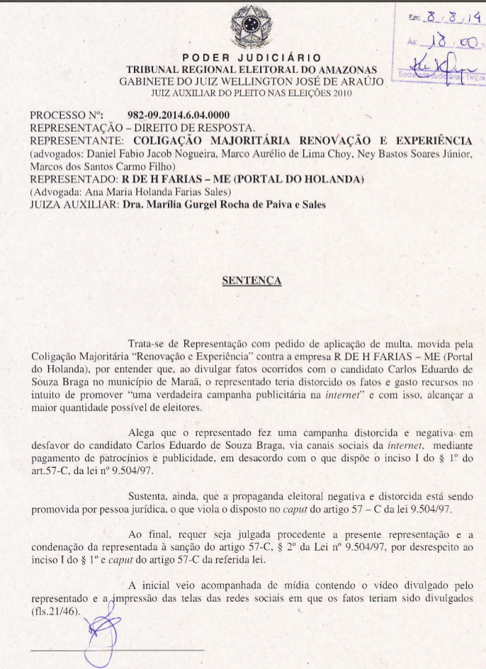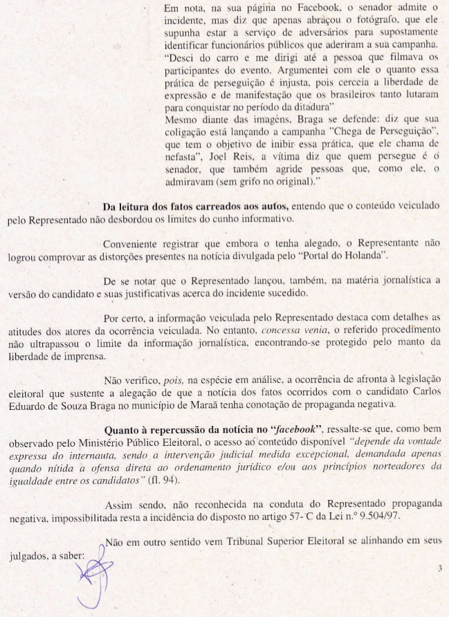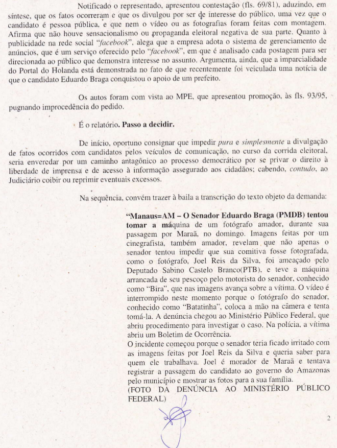 O Portal do Holanda não fez propaganda negativa contra o senador Eduardo Braga (PMDB), ao divulgar em sua página e nos seus canais nas redes sociais vídeo no qual o senador aparece coagindo um fotografo amador no municipio de Maraã. ( Clique Aqui reveja Vídeo ) Também não houve "distorção dos fatos", conforme afirmou na ação o advogado da Coligação Renovação e Experiência, Daniel Jacob Nogueira. A decisão é da juiza federal Marilia Gurgel Rocha de Paiva e Sales.