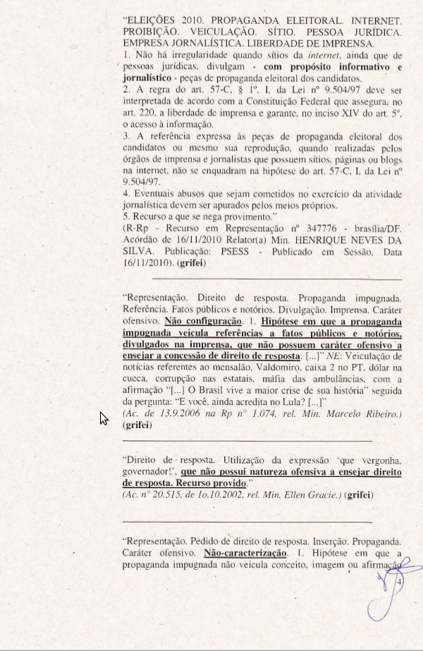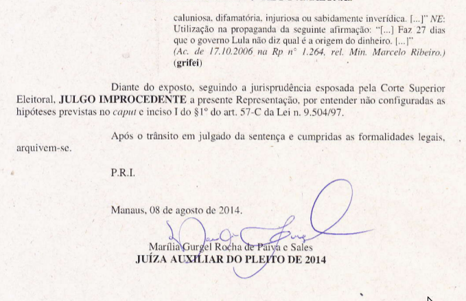 A juiza entendeu que o Portal do Holanda , ao noticiar o fato e divulgar a versão do senador, foi imparcial, e que "impedir a divulgação de fatos ocorridos com candidatos pelos veiculos de comunicação, no curso da corrida eleitoral, seria enveredar por um caminho antagônico ao processo democrático por privar o direito à liberdade de imprensa".