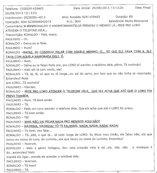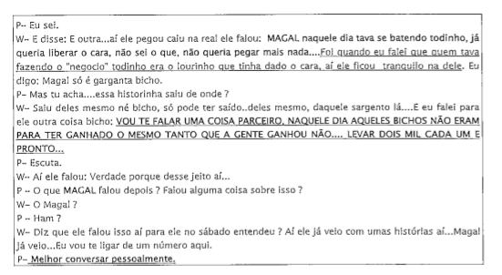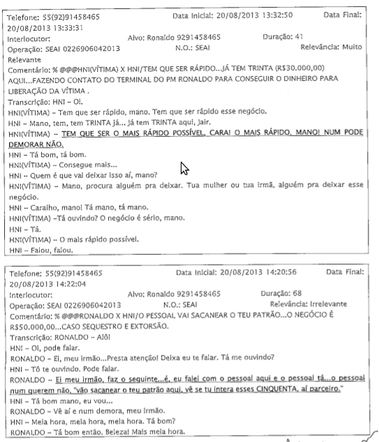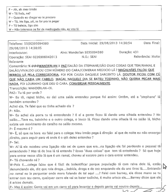 Trechos de escutas telefônicas autorizadas pela justiça revelam que a força tarefa criada para combater o tráfico doméstico em Manaus, na verdade se tornou uma aliada do crime, ao apreender e vender a droga para grupos traricantes rivais. Ganhava também para liberar lideres do tráfico preso. De um deles, pediu R$ 100 mil, mas aceitou R$ 55 pelo suborno. O processo, com a transcrição das escutas, está aberto no site do Tribubal de Justiça do Amazonas e pode ser acessado por qualquer pessoa interessada.