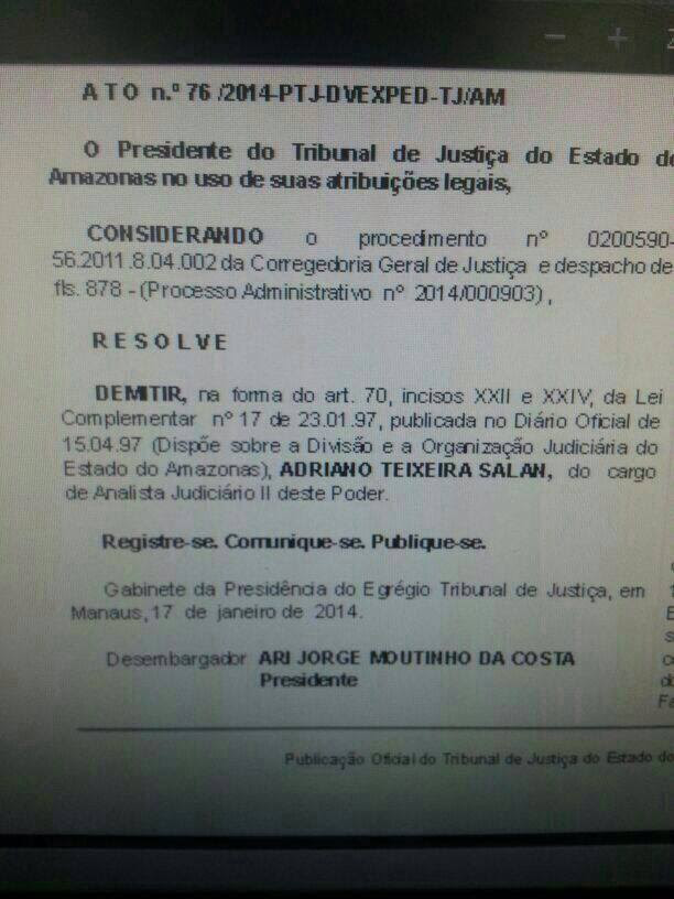 Por vender facilidades no Tribunal de Justiça do Amazonas e fazer advocacia administratica, o analista judiciário do Tribunal de Justiça do Amazonas, Adriano Salan, foi demitido. Salan funcionava como assessor do governo de Coari, na primeira gestão prefeito Adail Pinheiro.