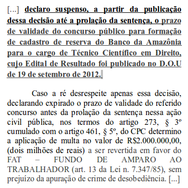 Em decisão liminar proferida na Ação Civil Pública ajuizada pela Procuradoria Regional do Trabalho da 11ª Região contra o Banco da Amazônia, o Juiz Substituto Túlio Macedo Rosa e Silva suspendeu o prazo de validade do concurso promovido pela banco para formação de cadastro de reserva para o cargo de Técnico Científico em Direito, alegando que verificou que o Basa contratou serviços advocatícios terceirizados, em detrimento da nomeação dos candidatos aprovados no concurso público para formação de cadastro de reserva. O juiz determina que, caso o Banco deixe de cumprir a decisão, terá que pagar multa de R$ 2 milhões. A medida beneficia 30 candidatos.