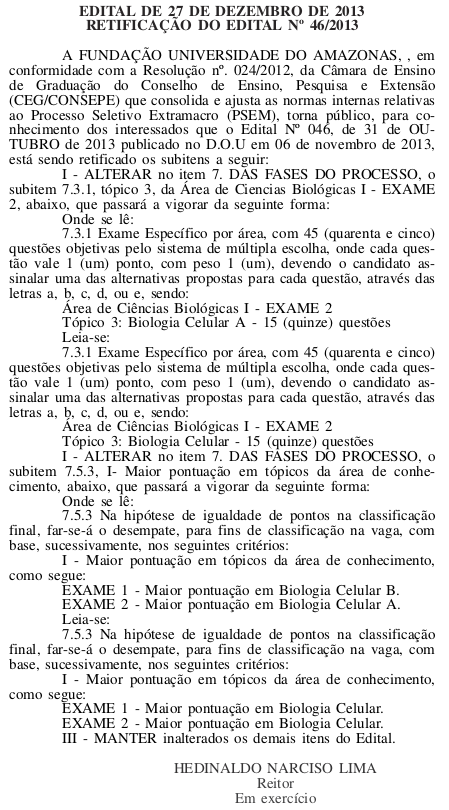 A Universidade Federal do Amazonas alterou edital relativo ao processo seletivo extramacro, conhecido como (PSEM). O edital com alterações foi publicado no Diário Oficial da União que circulou nesta terça-feira. Confira: