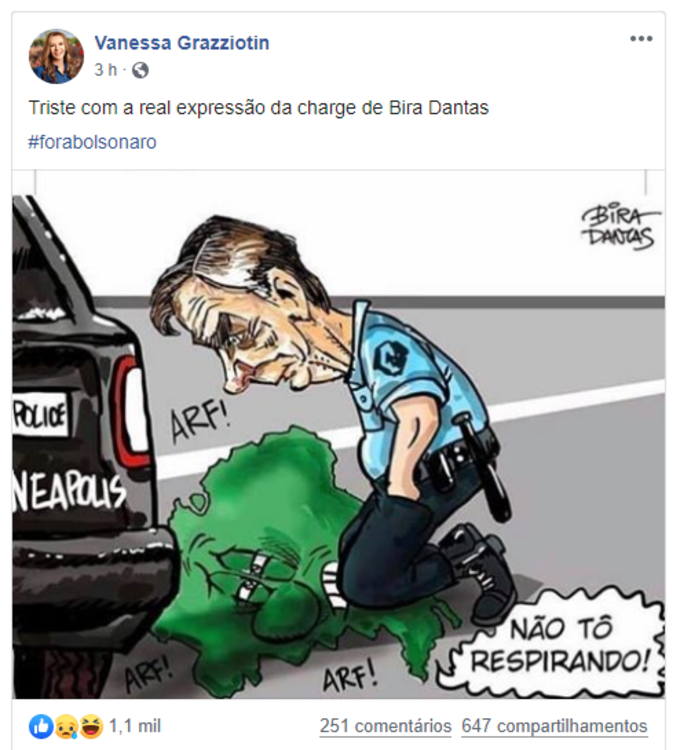 A imagem é uma critica ao governo Bolsonaro e faz comparação com o caso do assassinato de George Floyd, homem negro que foi morto asfixiado por um policial nesta semana nos Estados Unidos da América, em Minneapolis. O agente se ajoelhou sobre o pescoço dele o imobilizando até a morte.