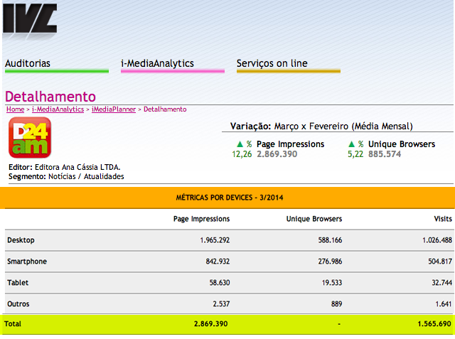 Veja resultado de auditoria realizada, em março, pelo Instituto de Verificação de Circulação (IVC) nos 62 sites filiados. Resultado na Região Norte e ranking Nacional. Você também pode acompanhar os dispositivos usados por internautas para acessar o Portal do Holanda - Desktop, smartphone, tablet e outros.