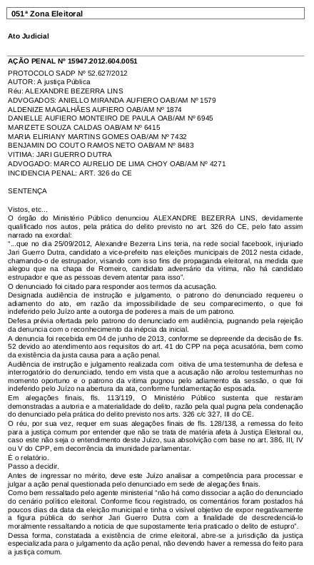 O vereador Alexandre Bezerra Lins(PSD) utilizou sua página no Facebook para caluniar e difamar o vice-prefeito de Presidente Figueiredo, Jair Guerra Dutra (PR), chamando-o de estuprador,e foi condeando a três anos e quatro meses de prisão. Veja a sentença da juíza Ana Paula, na íntegra:
