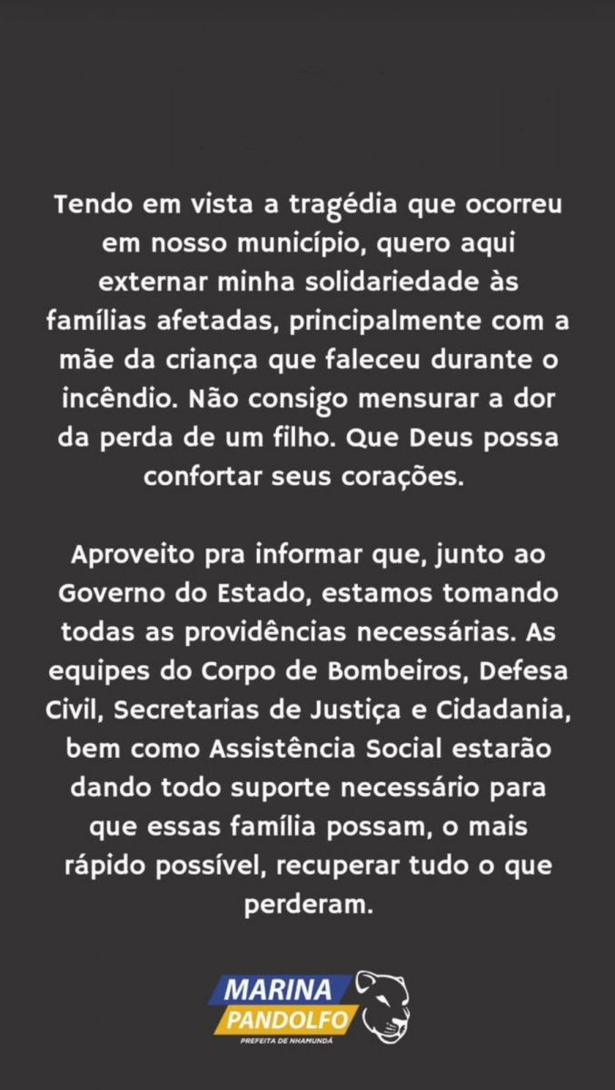 A prefeita da cidade, Marina Pandolfo, admitiu uma nota de solidariedade à família da criança e afirmou que está mobilizando a prefeitura e o governo em busca de auxílio para os moradores afetados.