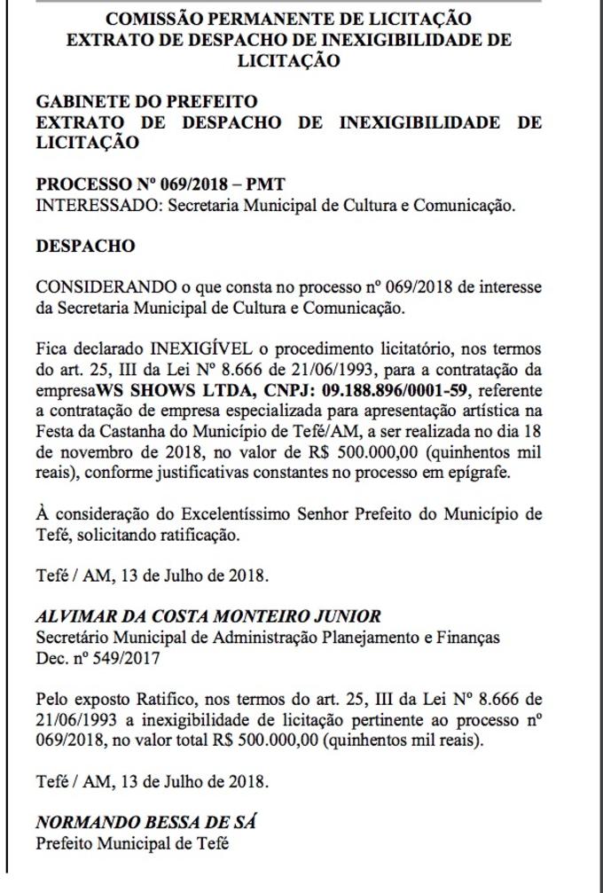 Manaus/AM - A Festa da Castanha no município de Tefé, que será realizada no dia 18 de novembro, deve contar com Wesley Safadão como atração principal, pelo custo de R$ 500 mil. O prefeito da cidade Normando Bessa de Sá assinou um contrato com a empresa WS Show Ltda, que pertence ao cantor, sem licitação. O extrato de despacho de inexigibilidade de licitação foi publicado nesta segunda-feira (16) no Diário Oficial dos Municípios do Amazonas.