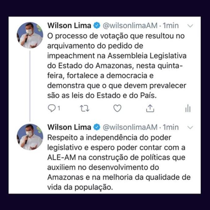 Manaus/AM - O governador do Amazonas, Wilson Lima (PSC), se manifestou nas redes sociais, nesta quinta-feira (6), após a Assembleia Legislativa do Amazonas (Aleam) arquivar o pedido de impeachment contra ele. De acordo com a postagem, Wilson disse o arquivamento “fortalece a democracia”.