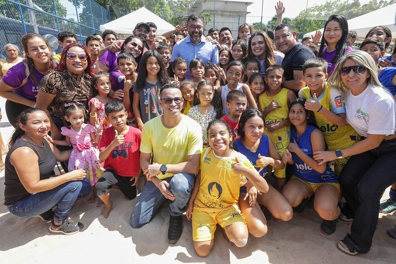 Manaus/AM - O governador Wilson Lima inaugurou, neste sábado (21/09), a nova quadra da comunidade Jesus Me Deu, no bairro Colônia Terra Nova, zona norte de Manaus. O espaço desportivo, que recebeu serviços de revitalização e ampliação da estrutura, beneficiará cerca de 56 mil moradores da comunidade e entorno, além de contar com um novo núcleo do Programa Esporte e Lazer na Capital e Interior (Pelci).
