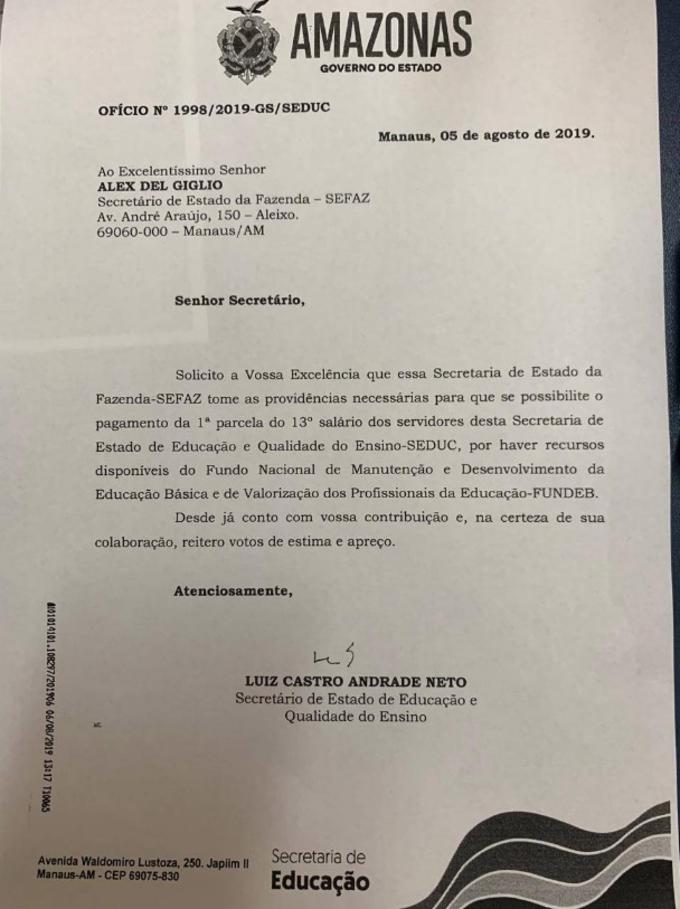 Manaus/AM - A Secretaria de Estado de Educação do Amazonas (Seduc) enviou um pedido à Secretaria de Fazenda (Sefaz), para liberar recursos do Fundeb para pagamento da primeira parcela do 13º salário dos trabalhadores da educação no Amazonas. Pedido foi enviado nesta segunda-feira (5).