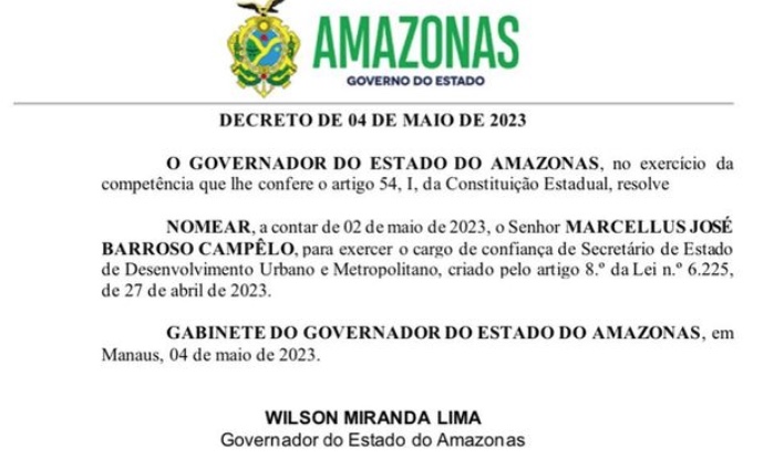 O decreto de nomeação foi assinado pelo governador Wilson Lima nessa quinta-feira (4), conforme divulgou o próprio secretário Marcellus em suas redes sociais.