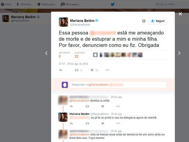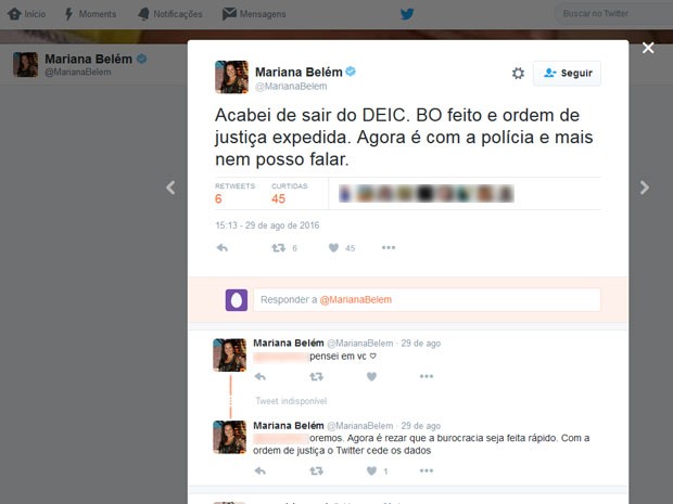 Mariana registrou Boletim de Ocorrência e publicou em seu Twitter: “BO feito e ordem de Justiça expedida. Agora é com a polícia e nada mais posso falar."