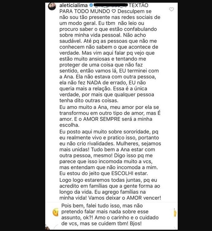 Sobre isso, Letícia comentou: “Não crio rivalidades. Mulheres, sejamos mais unidas. Tudo bem a Ana estar com outra pessoa, mesmo! Digo isso porque me parece que isso incomoda muito a vocês, mas entendam que não incomodam a mim. Estou do jeito que eu queria estar. Logo estaremos todas juntas, porque eu acredito em famílias que a gente forma ao longo da vida. Vamos deixar o amor vencer!”.