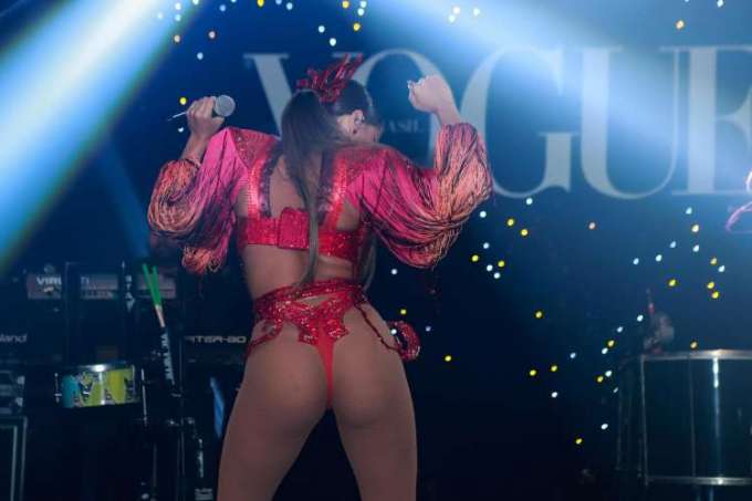 A peça larga na frente e estilo cintura alta, constratava com a parte de trás, um fio dental saliente que destacou ainda mais o bumbum da funkeira. Os fãs foram a loucura e gritavam: “Gostosa”, “Musa”.