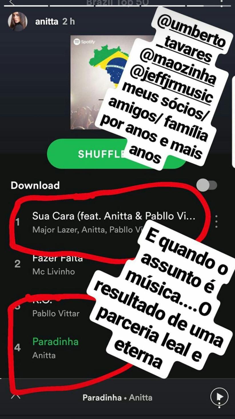 Ao mostrar que o hit “Sua Cara” é a música mais escutada do Spotify, Anitta escreveu: “E quando o assunto é musica…O resultado de uma parceria leal e eterna”.
