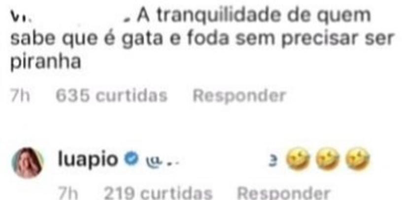 A ex-atriz e apresentadora anda respondendo comentários de internautas que criticam Anitta, e parece concordar com as afirmações: Ao comentário: "A tranquilidade de quem sabe que é gata e f*** sem precisar ser piranha", Luana respondeu com emojis de risada.