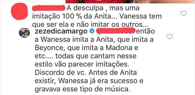 Zezé rebateu: "Então a Wanessa imita a Anitta, que imita a Beyonce, que imita a Madona e etc... todas que cantam nesse estilo vão parecer imitações. Discordo de vc."