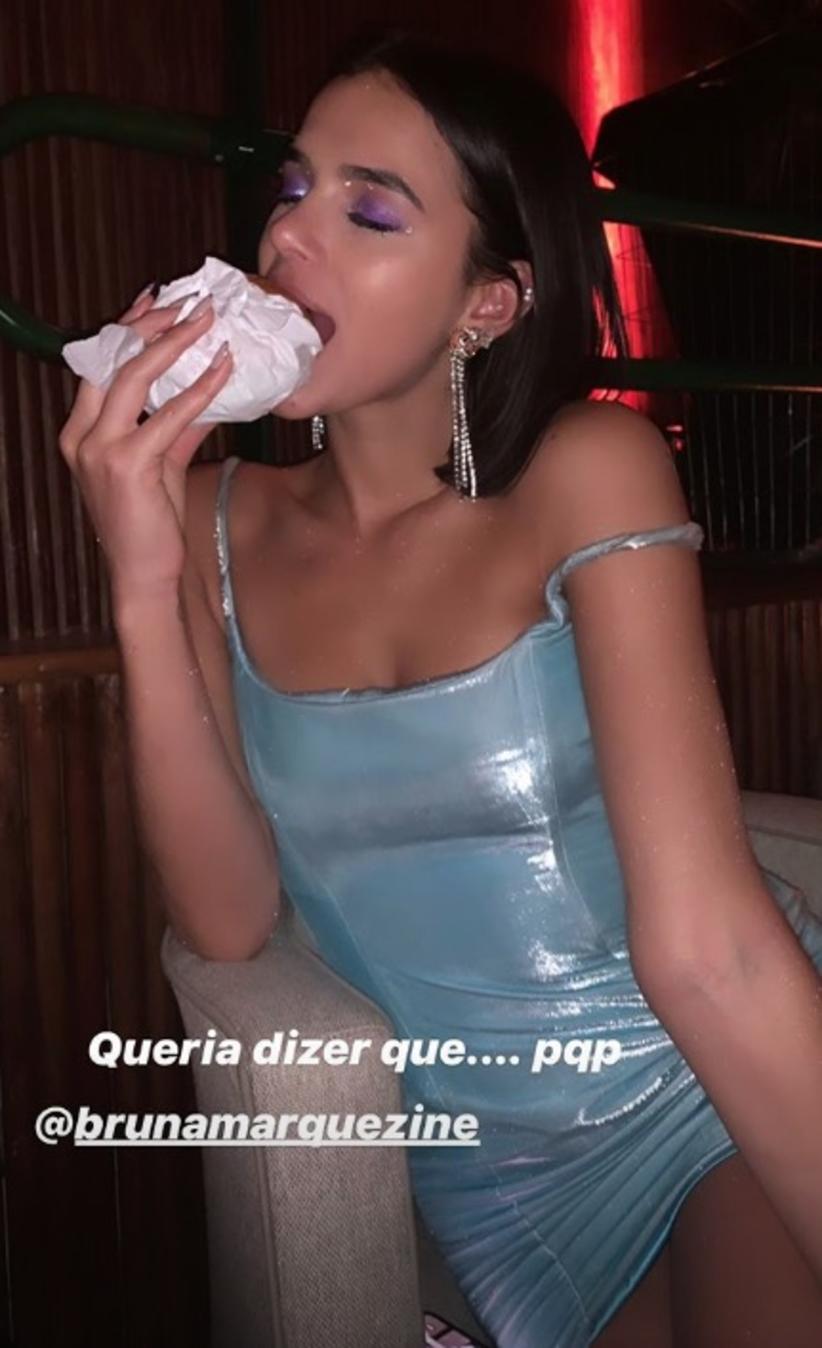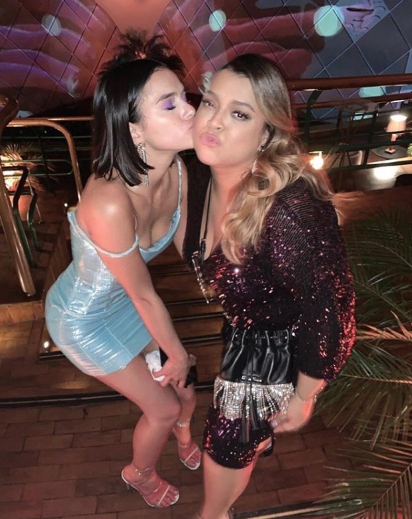 A festa contou com apresentação do Tropkillaz e de Luísa Sonza. Depois de cansar do salto, Bruna trocou as sandálias por um par de tênis para dar seguimento à noitada.