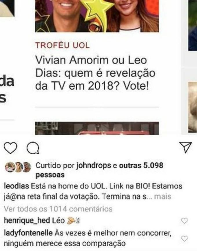 "Vivian Amorim ou Léo Dias: quem é a revelação da TV em 2018? Vote!", dizia a matéria, e Fontenelle comentou: "Às vezes é melhor nem concorrer, ninguém merece essa comparação".