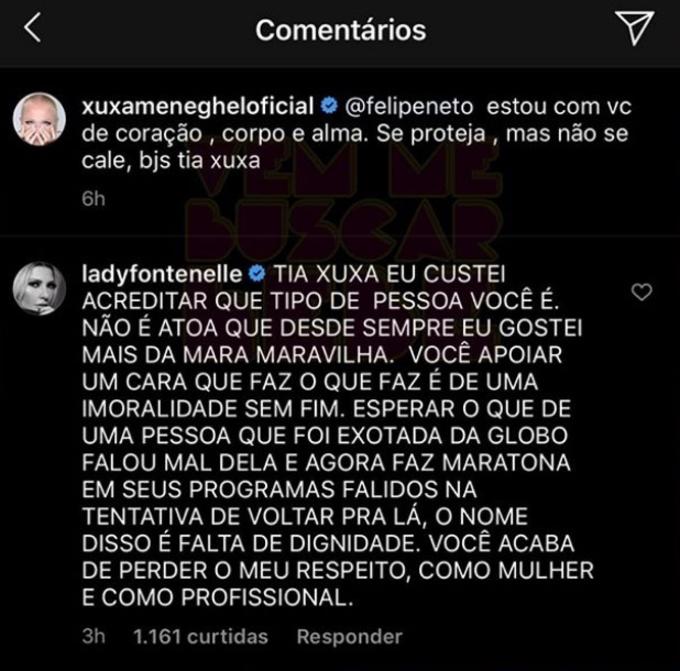 Quem não gostou nada da mensagem foi Antonia Fontenelle, que está sendo processada pelo youtuber e pelo irmão, Lucas Neto, por ter associado a imagem dos dois à pedofilia. “Tia Xuxa, eu custei a acreditar que tipo de pessoa você é. Não é à toa que desde sempre eu gostei mais da Mara Maravilha. Você apoiar um cara que faz o que faz é de uma imoralidade sem fim. Esperar o que de uma pessoa que foi enxotada da Globo, falou mal dela e agora faz maratona em seus programas falidos na tentativa de voltar para lá. O nome disso é falta de dignidade. Você acaba de perder o meu respeito como mulher como profissional”, escreveu.