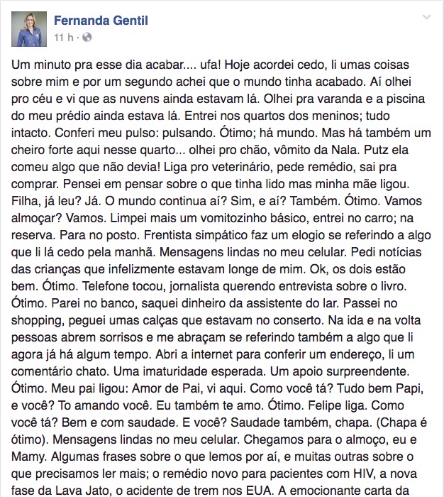 Relatando o dia a dia, Fernanda chama os críticos de imaturos. “Passei no shopping, peguei umas calças que estavam no conserto. Na ida e na volta pessoas abrem sorrisos e me abraçam se referindo também a algo que li agora já há algum tempo. Abri a internet para conferir um endereço, li um comentário chato. Uma imaturidade esperada”.