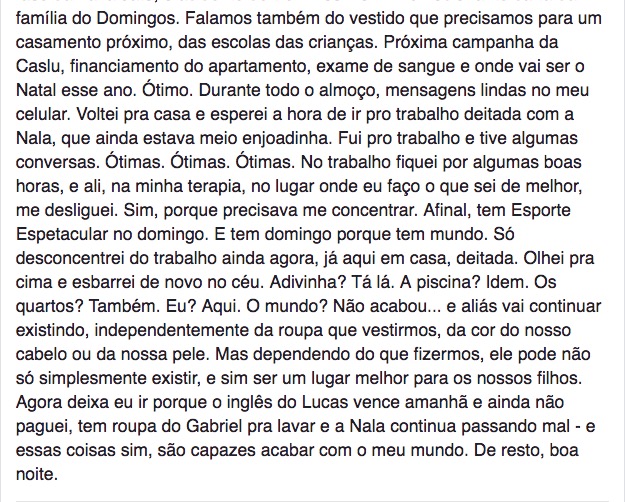 Para finalizar, a jornalista diz que o mundo ainda não acabou. “Olhei pra cima e esbarrei de novo no céu. Adivinha? Tá lá. A piscina? Idem. Os quartos? Também. Eu? Aqui. O mundo? Não acabou... e aliás vai continuar existindo, independentemente da roupa que vestirmos, da cor do nosso cabelo ou da nossa pele”.