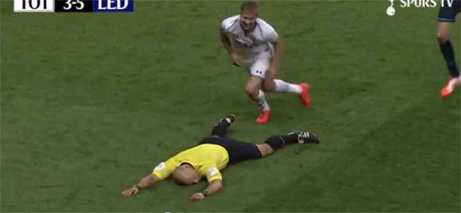 Com o jogo rolando no meio campo, Howard Webb roubou a bola e saiu driblando até que o alemão Lewis Holtby entrou na brincadeira e foi desarmá-lo com um carrinho por trás. Animado, Webb se jogou no chão e foi provocado por Holtby que o mandou levantar. O árbitro inglês não deixou barato e devolveu a "forte entrada" com um empurrão no meia.
