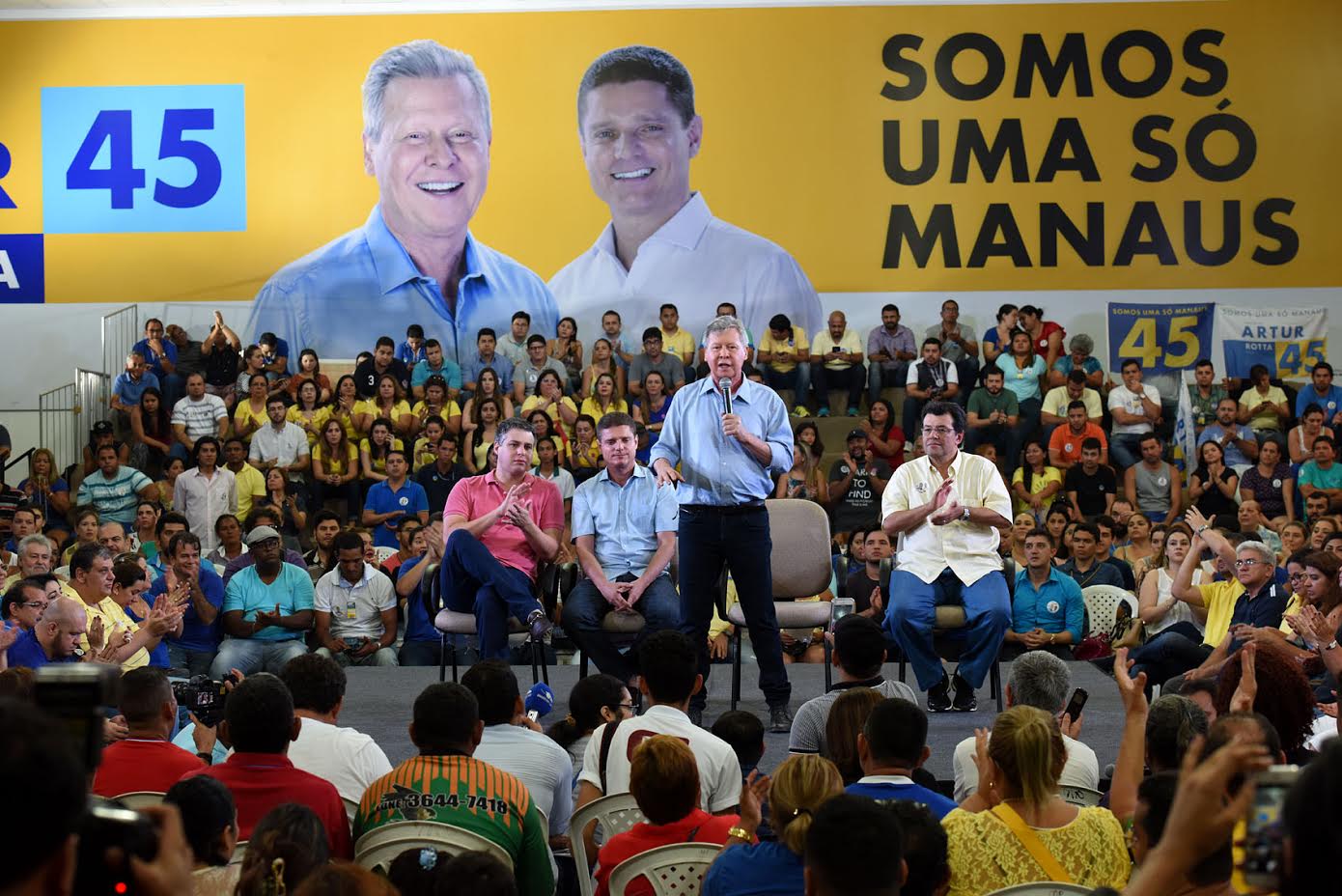 Na coletiva, realizada na Estação 45, zona Leste da cidade, o prefeito estava acompanhado de seu candidato a vice, Marcos Rotta, do senador Eduardo Braga e do deputado federal Artur Bisneto. Secretários, candidatos a vereador eleitos e não eleitos, simpatizantes e militantes dos partidos da coligação lotaram o espaço, em clima de festa para comemorar o primeiro lugar no primeiro turno e reafirmar a disposição e garra para o segundo turno.