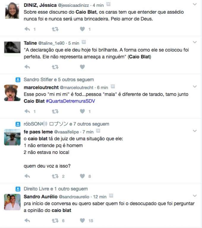 “Caio Blat falando merda ao tentar defendendo o indefensível”, disse um internauta. “Caio Blat é a exemplificação do macho tentando justificar o machismo de outro macho”, criticou outra pessoa.