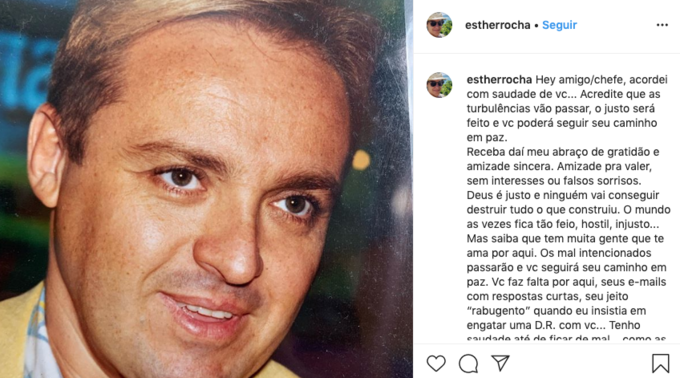 "Hey, amigo e chefe. Acordei com saudade de você. Acredite que as turbulências vão passar, o justo será feito e você poderá seguir seu caminho em paz. Receba daí meu abraço de gratidão e amizade sincera. Amizade pra valer, sem interesses ou falsos sorrisos.