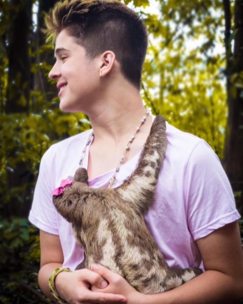 João Gui visitou a tribo Dessana, posou com boto e se disse apaixonado por Tiffany, uma preguiça com lencinho rosa.