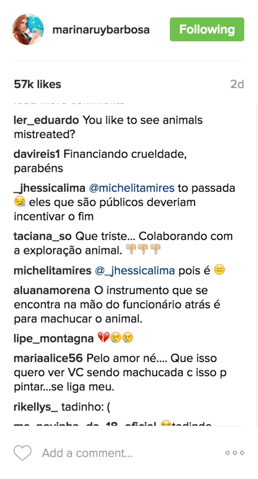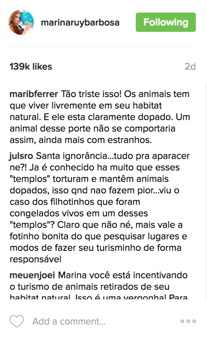 Logo que publicou as fotos, Marina foi se explicando afirmando que sabe que muitos lugares maltratam os animais mas que o santuário visitado por ela foi escolhido a dedo por não praticar tais atos contra os animais.