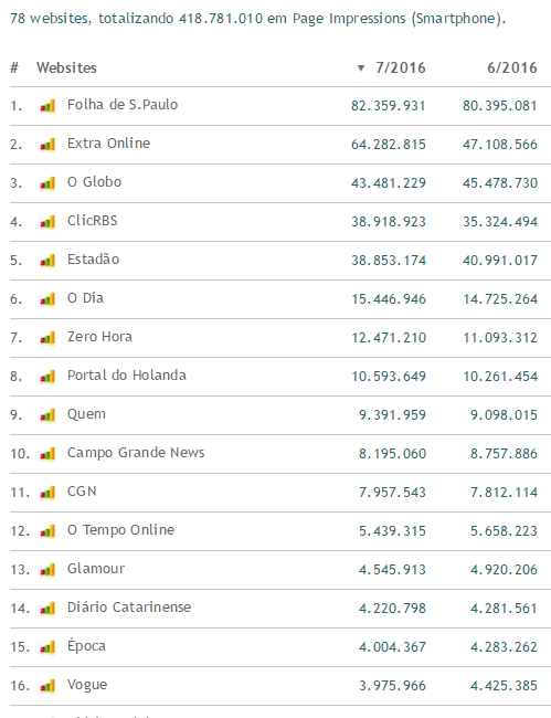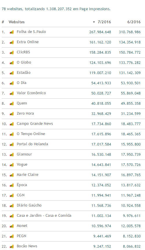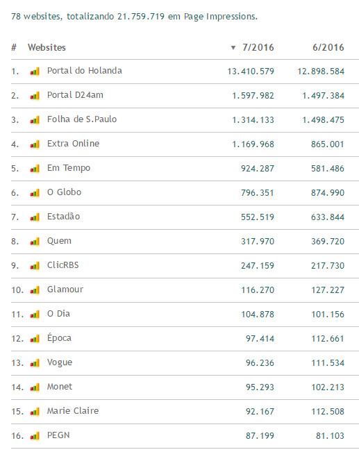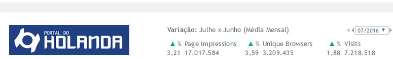 No total o Portal do Holanda apresentou crescimento em relação a junho de 3,21%( page impression) e de 3,59 em relação ao número de leitores, que podem ser recorrentes ou não (isto é, entraram mais de uma vez no site). O número de usuários únicos foi de 3,2 milhões. Abaixo tabelas que comprovam o crescimento em relação a junho deste ano;