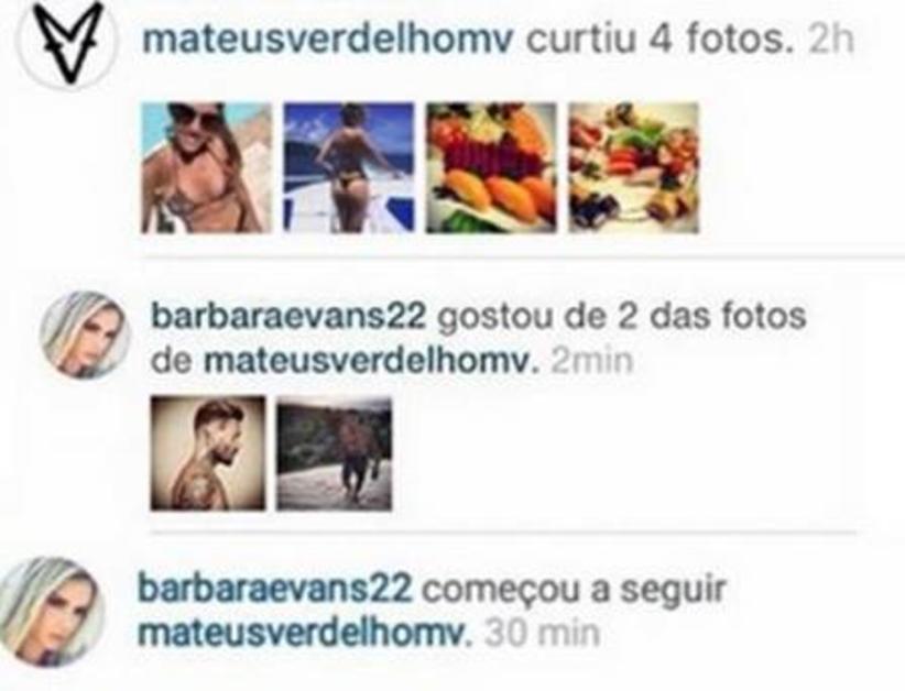 Isso porque o modelo passou a curtir as fotos de Evans nas redes sociais e a loira retribuiu começando a seguí-lo no Instagram. Os dois se conheceram no reality “A Fazenda” e engataram o relacionamento. Na época, eles não esconderam que fizeram sexo debaixo do edredom.