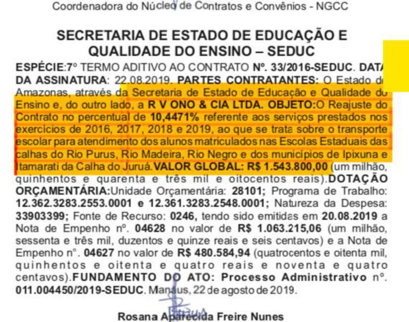 Há tantas brechas no direito administrativo que mesmo reajustes de contratos relativos a outras gestões podem ser de certa forma legais. Mas não se consegue, sem um grande prestígio, reajustar contratos de 2016, 2017 e 2018, como a empresa RV ONO, que faz transporte escolar nos rios Purus, Madeira e Rio Negro, sem uma grande dose de envolvimento com os poderosos de plantão.